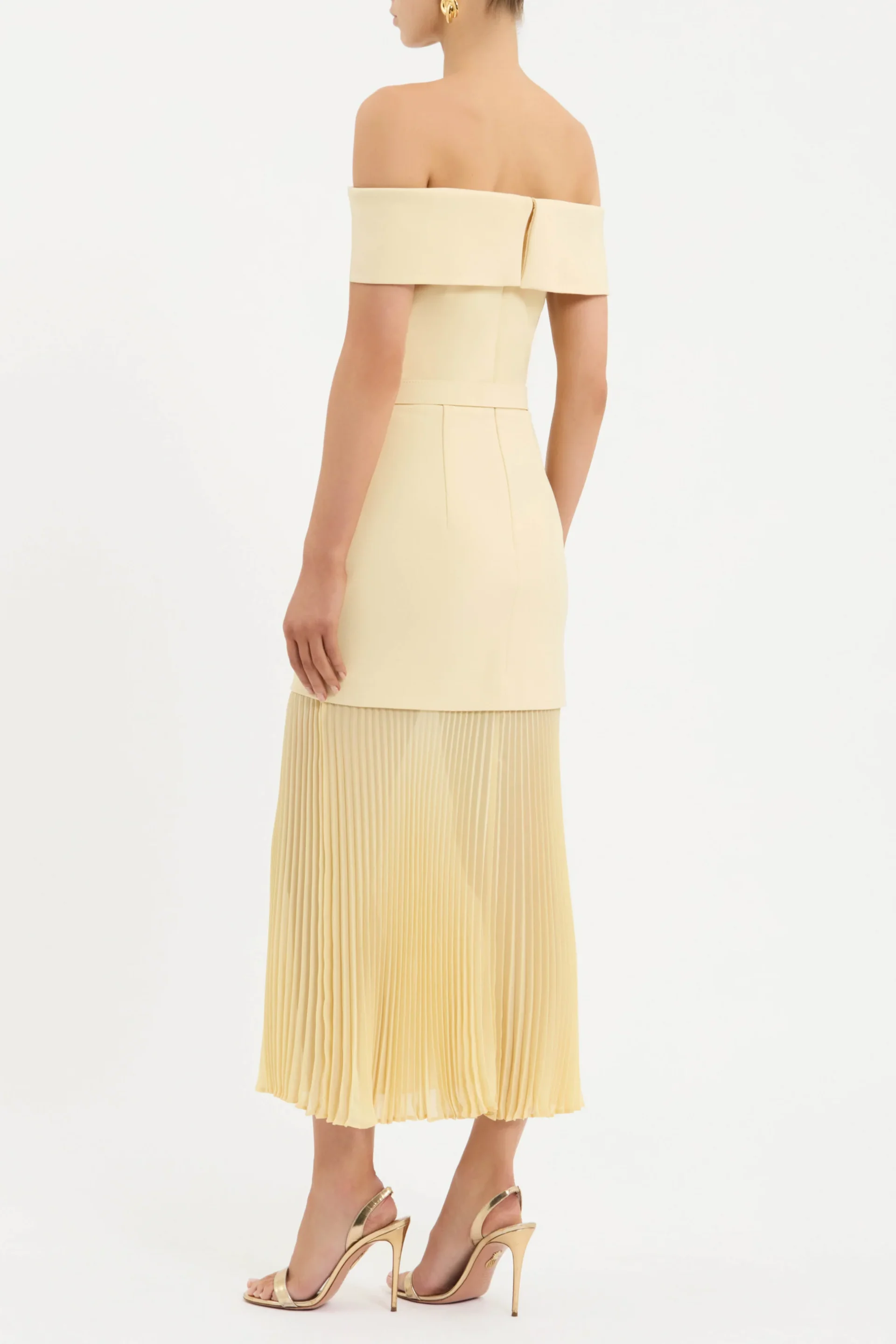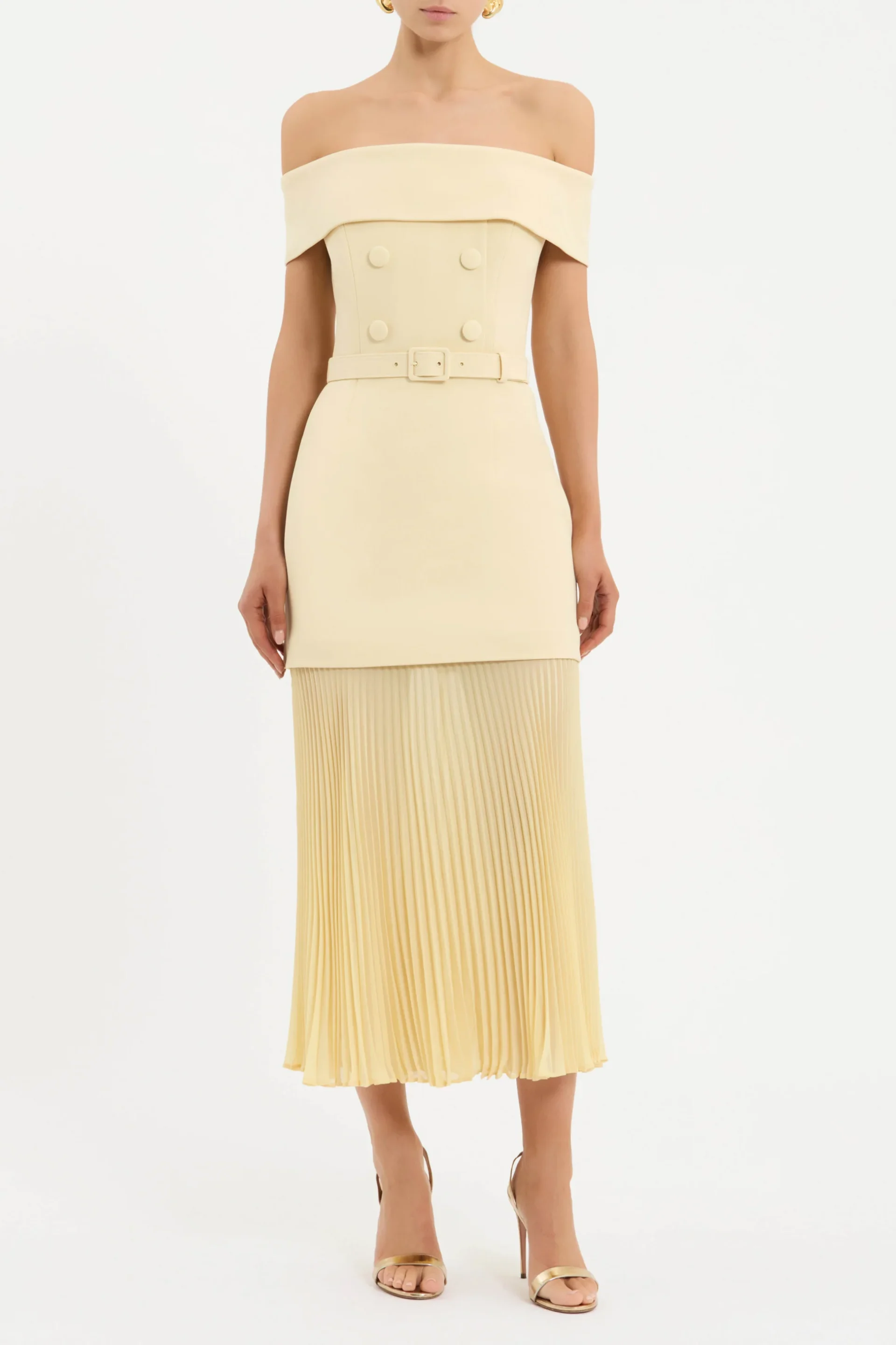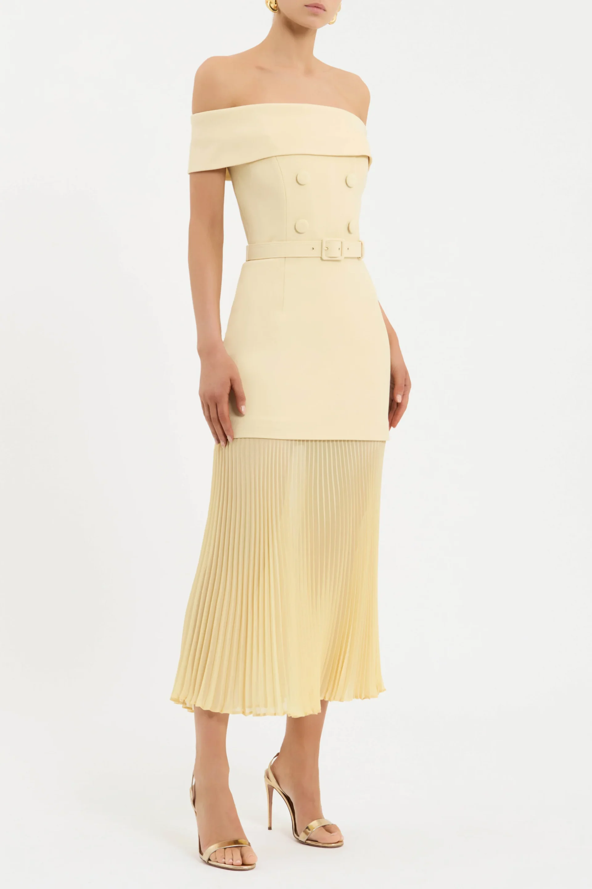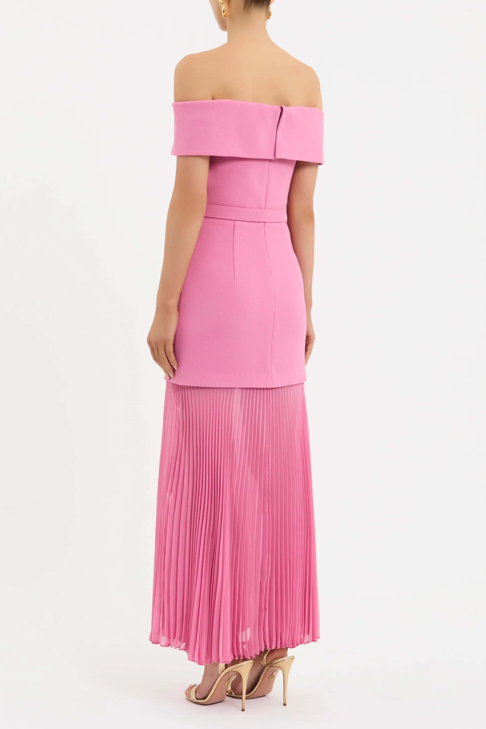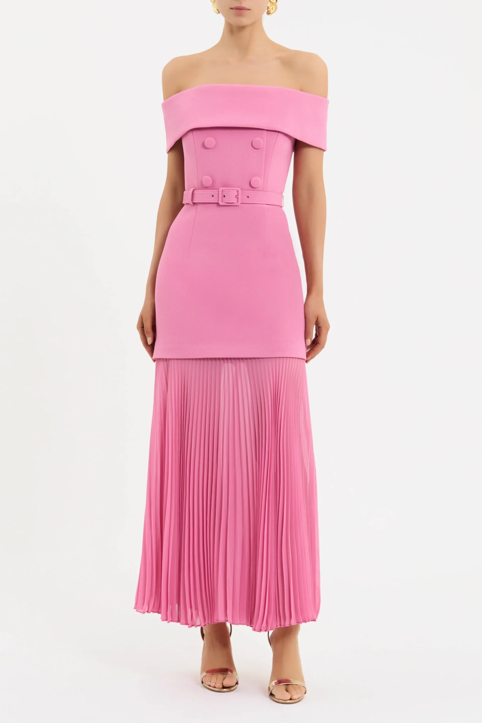 The Muriel Off The Shoulder Midi Dress brings a refined, feminine charm in a soft pink hue. Crafted from bonded crepe, it showcases a flattering off-the-shoulder neckline and a sculpted bodice with internal boning, finished with thoughtful button detailing. The waist is defined with a matching self-belt, flowing into a sheer, pleated midi skirt that creates elegant movement. Secured at the back with a zip, this piece transitions beautifully from daytime celebrations to evening occasions.