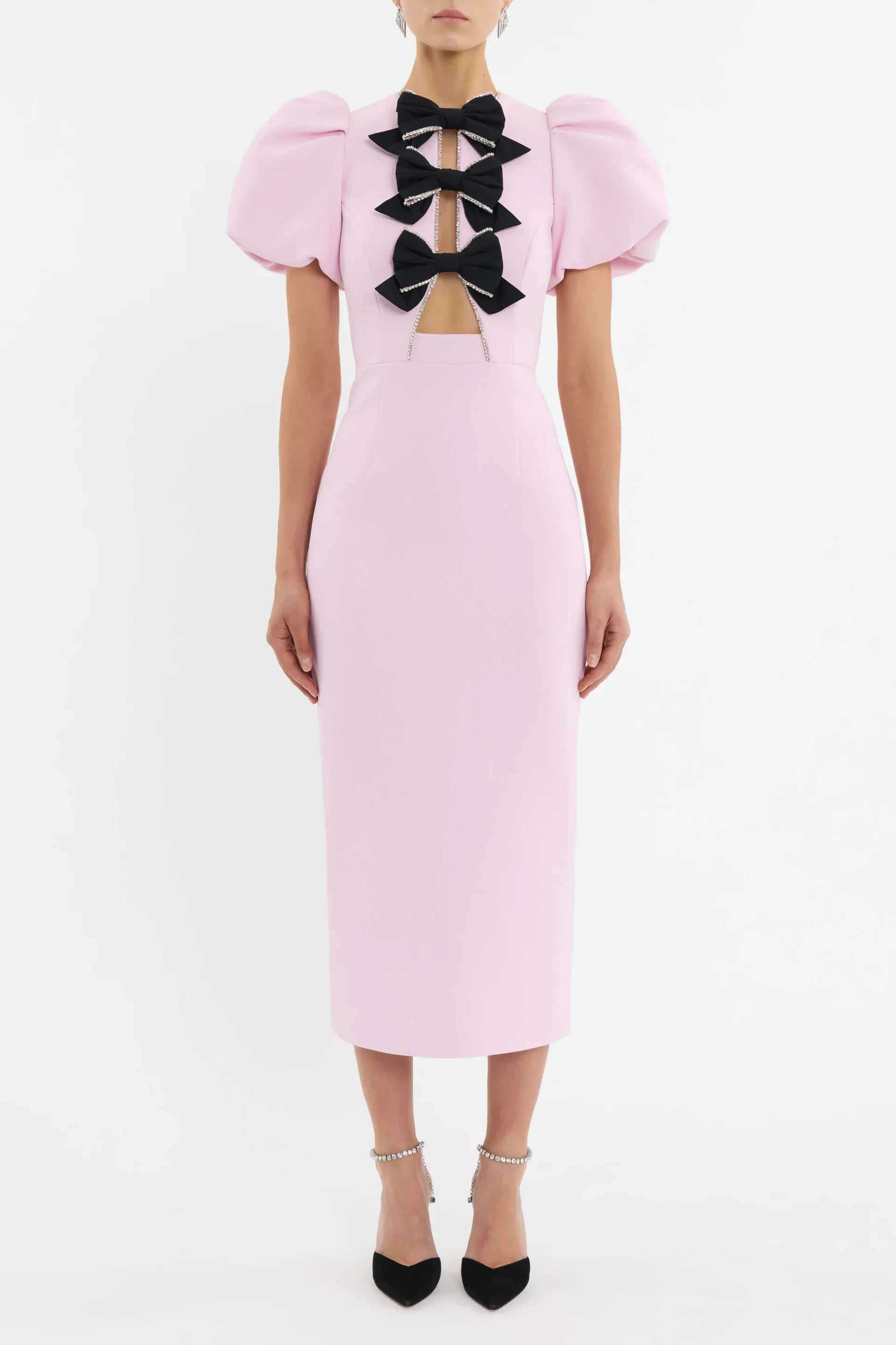 The Nemy Midi Dress radiates modern elegance in a soft pink bonded crepe. Its fitted bodice features delicate cut-out detailing and contrasting bow accents embellished with diamantes, perfectly balanced by voluminous short puff sleeves. Cinched at the waist to highlight the silhouette, it falls into a sleek pencil-length midi skirt with a back split for effortless movement and subtle allure. Fully lined and secured with a back zip, this piece offers a polished and sophisticated look for your next special occasion.