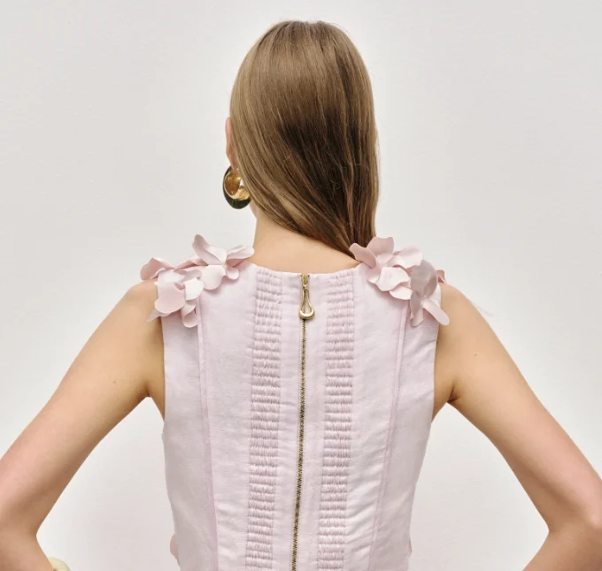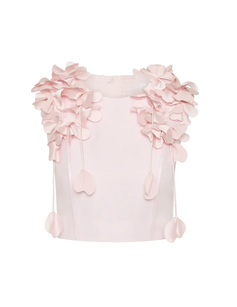 The top is designed with embroidered floral motifs, tassel detailing, a crew neckline, fitted bodice, and a straight cropped hem. An exposed back zip with sculptural puller completes the look.