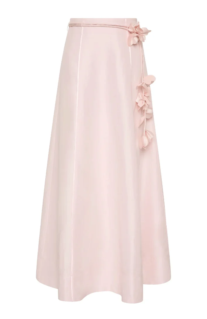 The skirt offers an A-line silhouette with belt loops, a detachable rouleau belt with floral detail, side pockets, and a secure zip with hook-and-eye closure. Fully lined for comfort and ease of wear.