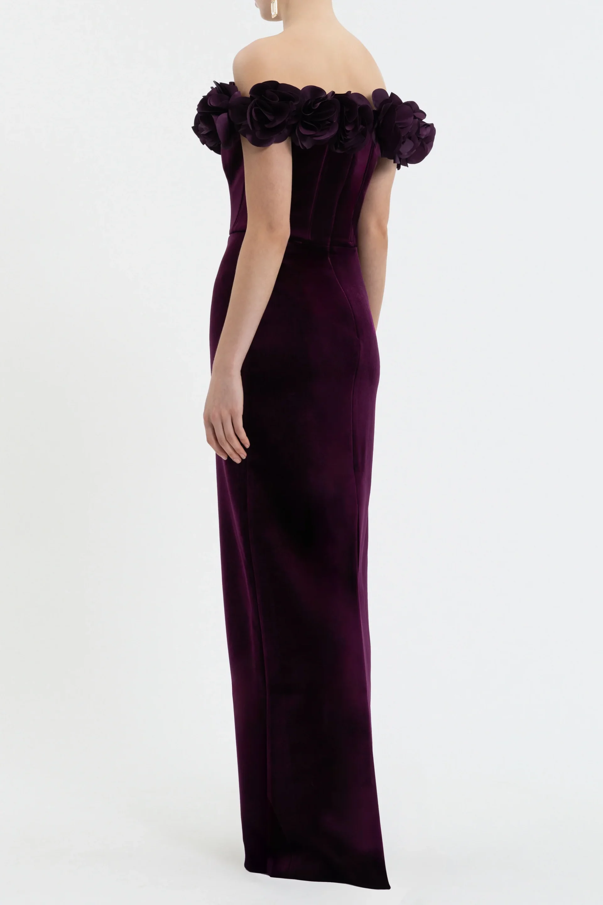 The Charles Strapless Gown in blackberry marries classic elegance with a modern edge. Crafted from luxurious velvet, it features an off-the-shoulder neckline embellished with delicate floral applique, complementing the sculpted bodice supported by internal boning. The streamlined column maxi skirt creates an effortlessly sophisticated silhouette, enhanced by a defined waist for a flattering shape. Finished with a back zip and subtle back split for ease of movement, this fully lined gown offers a poised and refined look for any formal occasion.