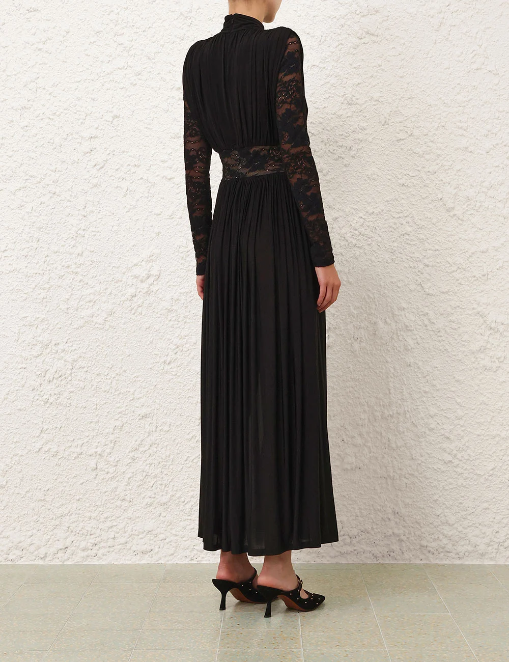 A dramatic draped maxi with heavy gathering, lace detailing, and a high collar — the Rebellion Draped Dress in Black embodies refined romance and elegant movement from the Twisted Romance collection.