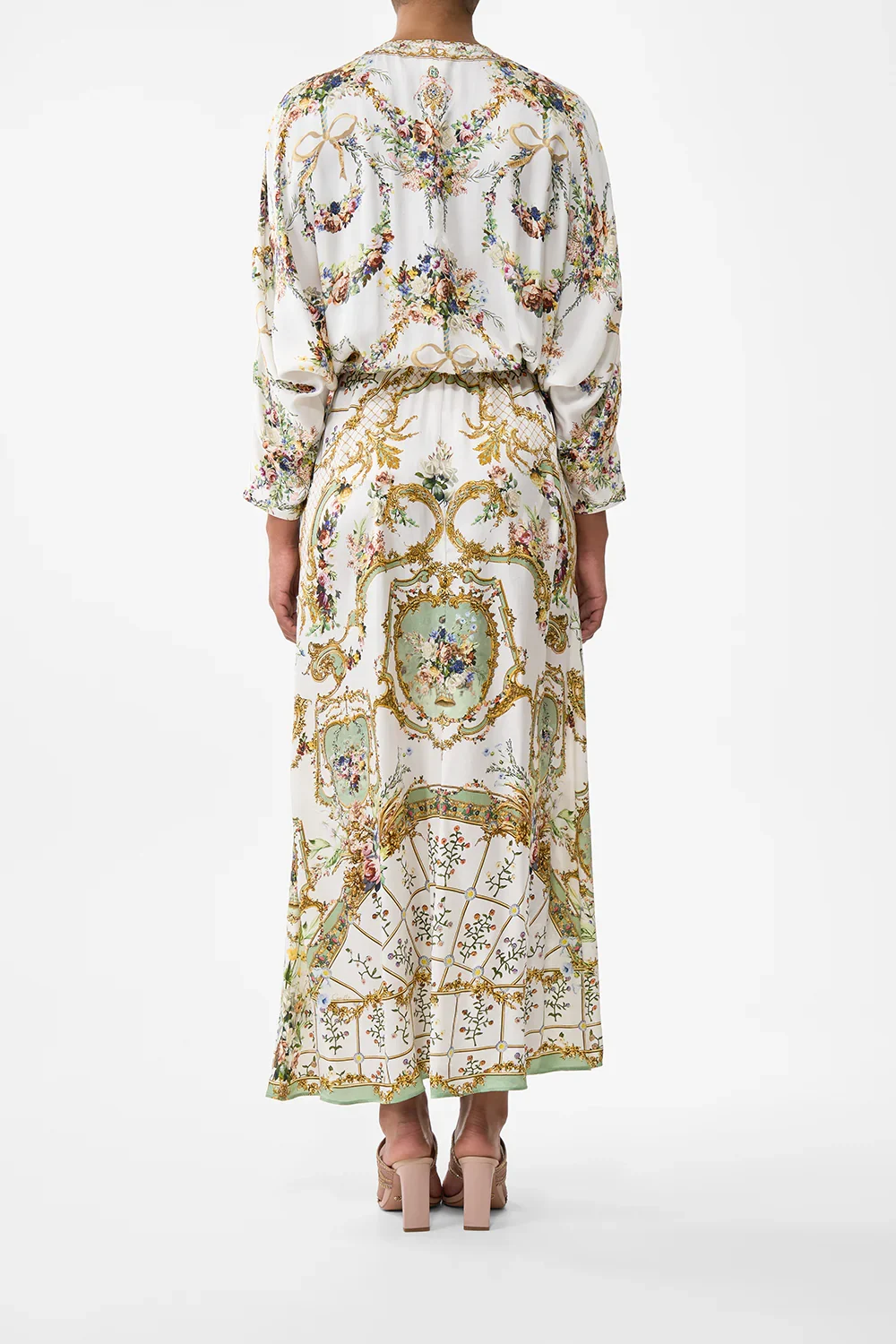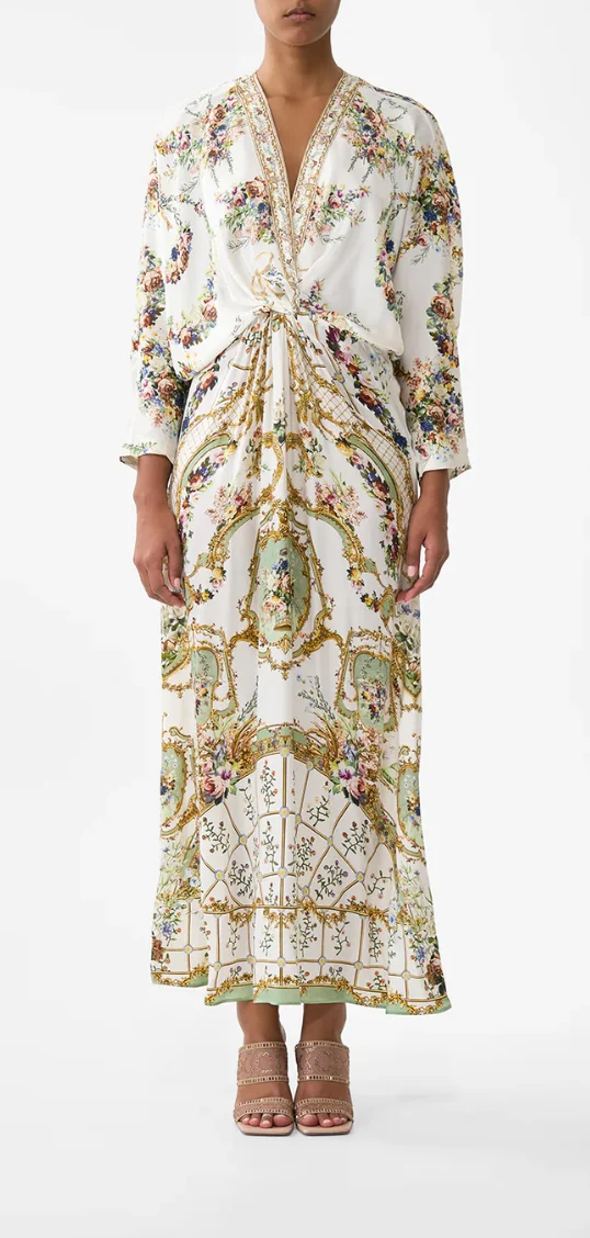 The Camilla Twist Front Batwing Dress is crafted from 100% silk with crystal embellishment. Designed with a twist-front detail, long batwing sleeves, and a full-length silhouette for a fluid drape.